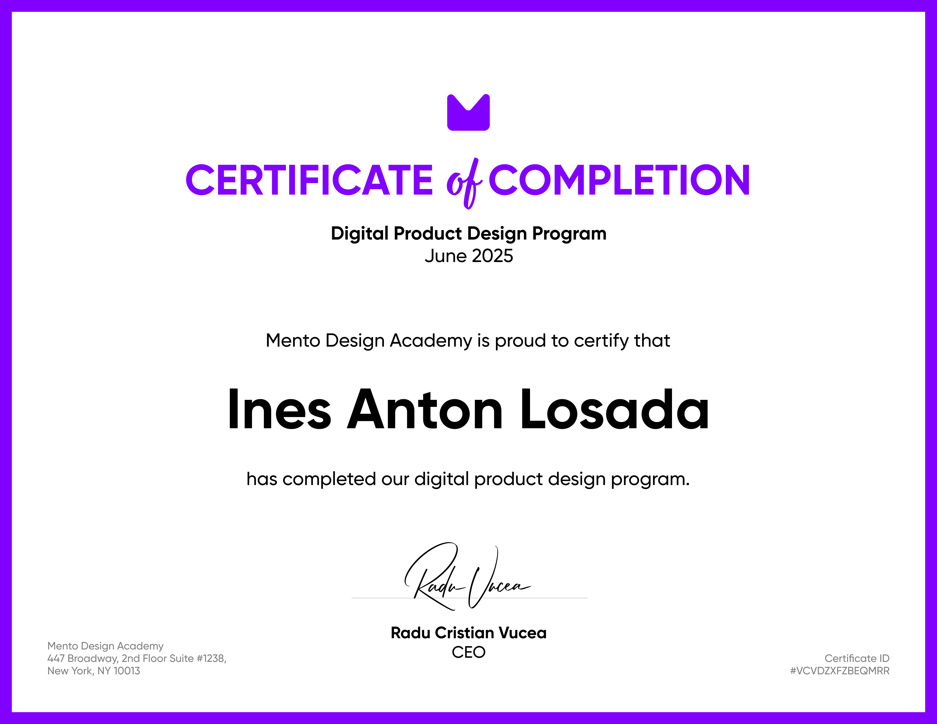 This certificate verifies that the student has successfully completed at least 24 weeks of training through the Digital Product Design Bootcamp at Mento Design Academy.